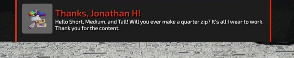 Thanks, Jonathan H! Hello Short, Medium, and Tall! Will you ever make a quarter zip? It's all I wear to work. Thank you for the content.
