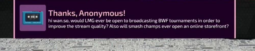 Thanks, Anonymous! hi wan.so, would LMG ever be open to broadcasting BWF tournaments in order to improve the stream quality? Also will smash champs ever open an online storefront?