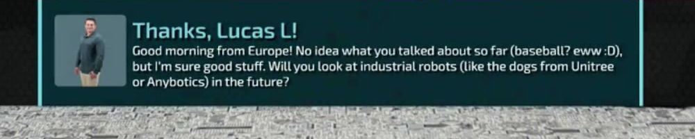 Thanks, Lucas L! Good morning from Europe! No idea what you talked about so far (baseball? eww :D), but I'm sure good stuff. Will you look at industrial robots (like the dogs from Unitree or Anybotics) in the future?