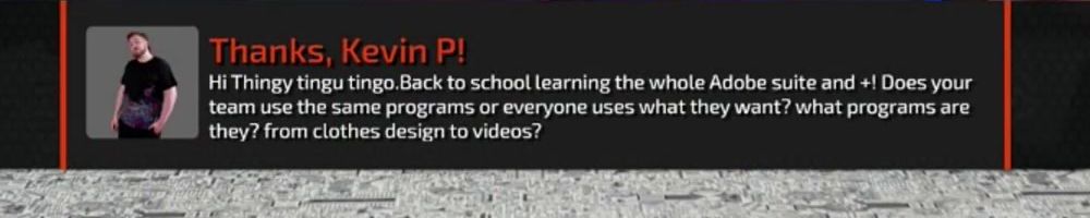 Thanks, Kevin P! Hi Thingy tingu tingo. Back to school learning the whole Adobe suite and +! Does your team use the same programs or everyone uses what they want? what programs are they? from clothes design to videos?
