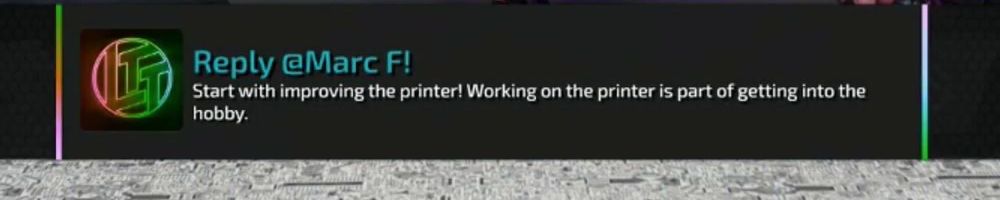 Reply @Marc F! Start with improving the printer! Working on the printer is part of getting into the hobby.