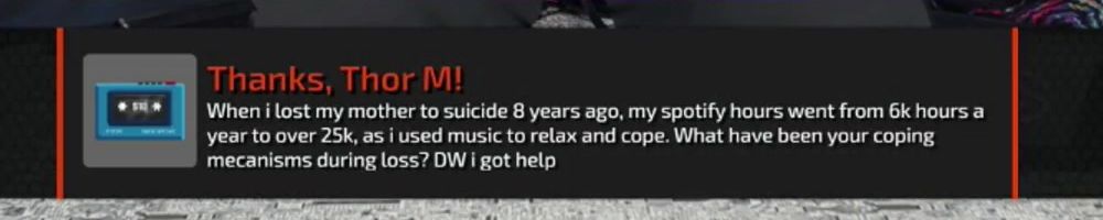 Thanks, Thor M! When i lost my mother to suicide 8 years ago, my spotify hours went from 6k hours a year to over 25k, as i used music to relax and cope. What have been your coping mecanisms during loss? DW i got help