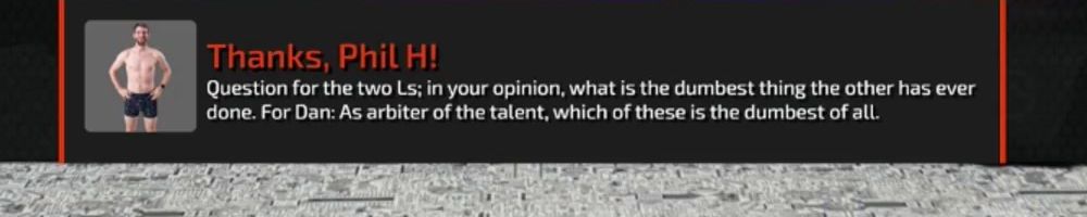 Thanks, Phil H! Question for the two Ls; in your opinion, what is the dumbest thing the other has ever done. For Dan: As arbiter of the talent, which of these is the dumbest of all.