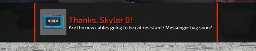 Thanks, Skylar B! Are the new cables going to be cat resistant? Messenger bag soon?