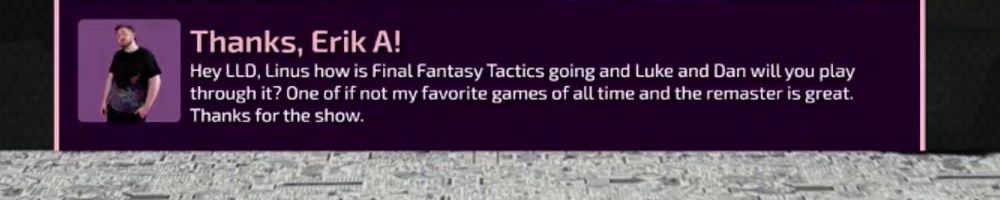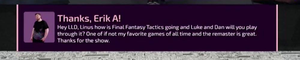 Thanks, Erik A! Hey LLD, Linus how is Final Fantasy Tactics going and Luke and Dan will you play through it? One of if not my favorite games of all time and the remaster is great. Thanks for the show.