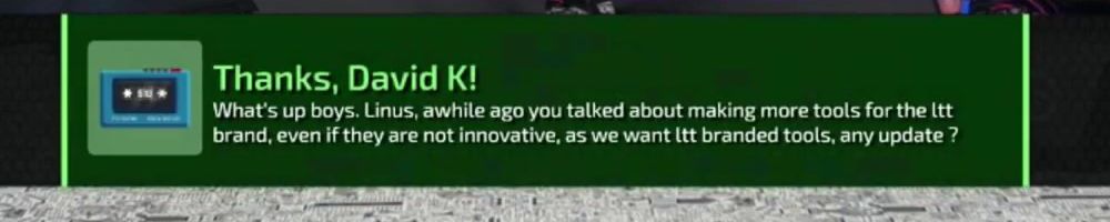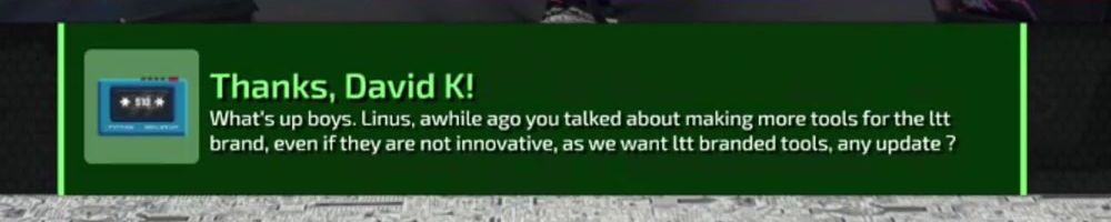 Thanks, David K! What's up boys. Linus, awhile ago you talked about making more tools for the ltt brand, even if they are not innovative, as we want ltt branded tools, any update ?