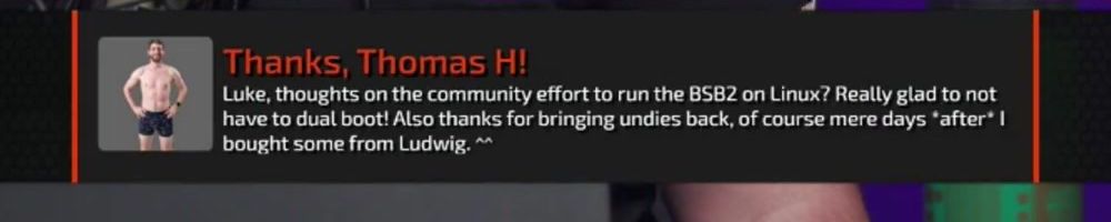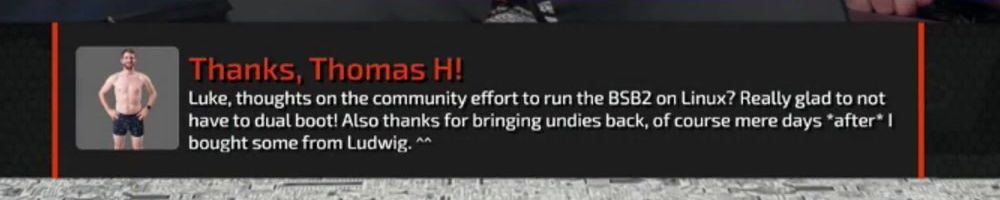 Thanks, Thomas H! Luke, thoughts on the community effort to run the BSB2 on Linux? Really glad to not have to dual boot! Also thanks for bringing undies back, of course mere days *after* I bought some from Ludwig. ^^