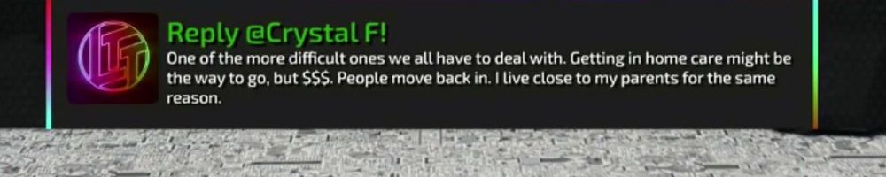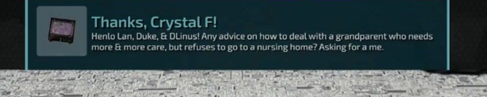Thanks, Crystal F! Henlo Lan, Duke, & DLinus! Any advice on how to deal with a grandparent who needs more & more care, but refuses to go to a nursing home? Asking for a me.