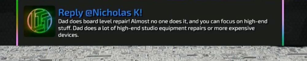 Reply @Nicholas K! Dad does board level repair! Almost no one does it, and you can focus on high-end stuff. Dad does a lot of high-end studio equipment repairs or more expensive devices.
