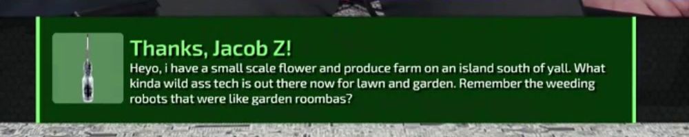 Thanks, Jacob Z! Heyo, i have a small scale flower and produce farm on an island south of yall. What kinda wild ass tech is out there now for lawn and garden. Remember the weeding robots that were like garden roombas?
