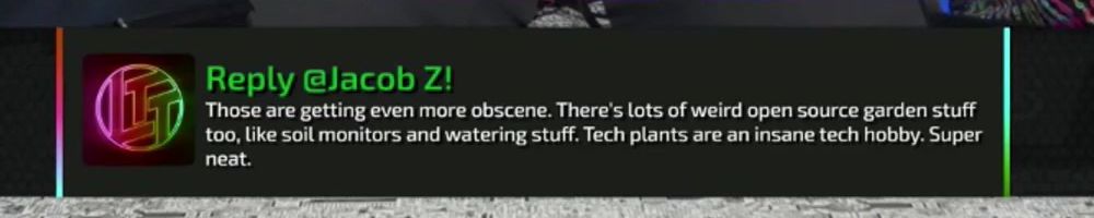 Reply @Jacob Z! Those are getting even more obscene. There's lots of weird open source garden stuff too, like soil monitors and watering stuff. Tech plants are an insane tech hobby. Super neat.