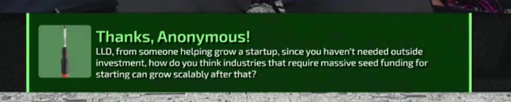 Thanks, Anonymous! LLD, from someone helping grow a startup, since you haven't needed outside investment, how do you think industries that require massive seed funding for starting can grow scalably after that?