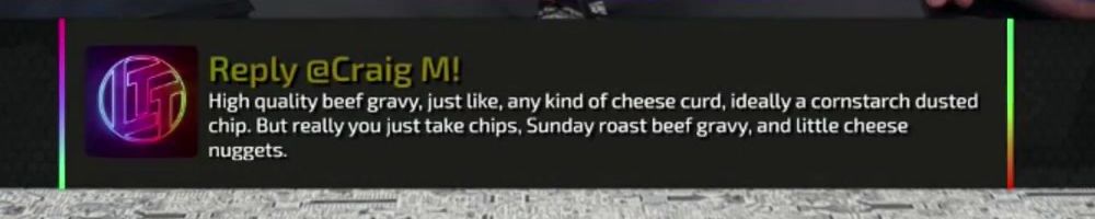 Reply @Craig M! High quality beef gravy, just like, any kind of cheese curd, ideally a cornstarch dusted chip. But really you just take chips, Sunday roast beef gravy, and little cheese nuggets.