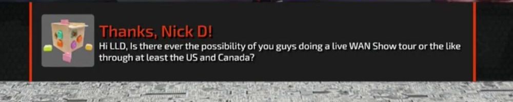 Thanks, Nick D! Hi LLD, Is there ever the possibility of you guys doing a live WAN Show tour or the like through at least the US and Canada?