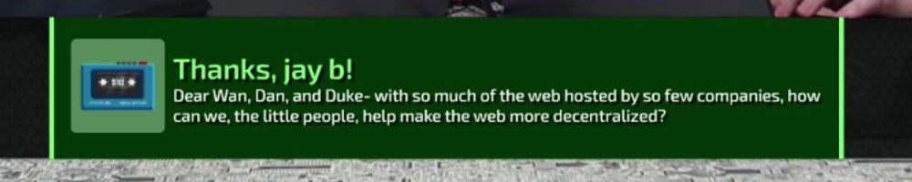 Thanks, jay b! Dear Wan, Dan, and Duke- with so much of the web hosted by so few companies, how can we, the little people, help make the web more decentralized?