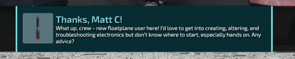 Thanks, Matt C! What up, crew - new floatplane user here! I'd love to get into creating, altering, and troubleshooting electronics but don't know where to start, especially hands on. Any advice?