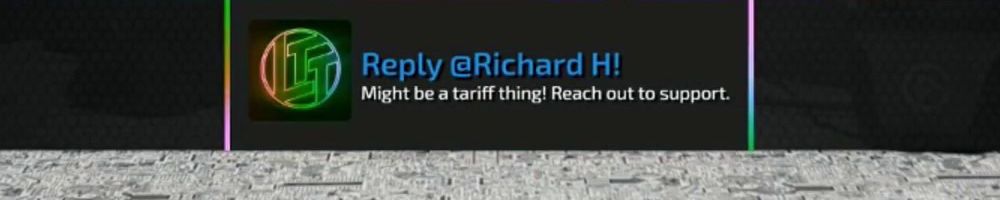 Reply @Richard H! Might be a tariff thing! Reach out to support.