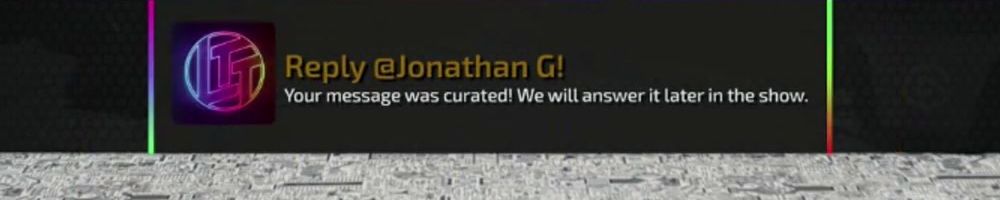 Reply @Jonathan G! Your message was curated! We will answer it later in the show.