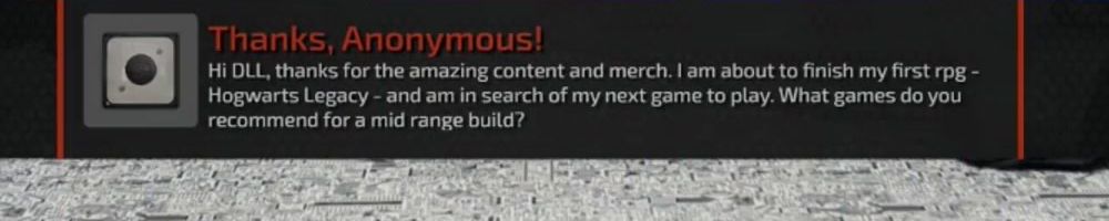 Thanks, Anonymous! Hi DLL, thanks for the amazing content and merch. I am about to finish my first rpg - Hogwarts Legacy - and am in search of my next game to play. What games do you recommend for a mid range build?