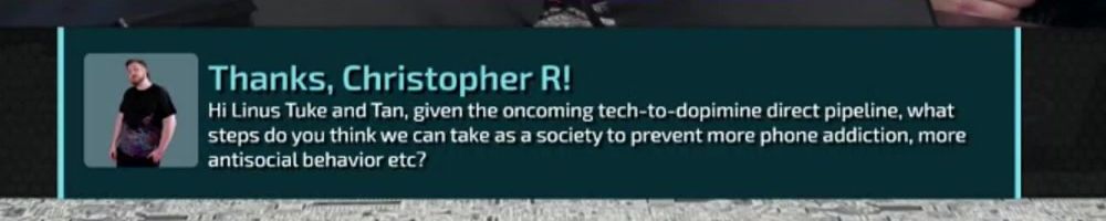 Thanks, Christopher R! Hi Linus Tuke and Tan, given the oncoming tech-to-dopimine direct pipeline, what steps do you think we can take as a society to prevent more phone addiction, more antisocial behavior etc?