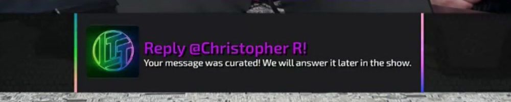 Reply @Christopher R! Your message was curated! We will answer it later in the show.