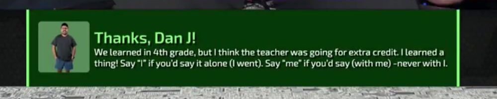 Thanks, Dan J! We learned in 4th grade, but I think the teacher was going for extra credit. I learned a thing! Say "I" if you'd say it alone (I went). Say "me" if you'd say (with me) - never with I.