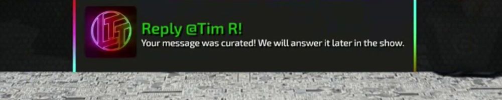 Reply @Tim R! Your message was curated! We will answer it later in the show.