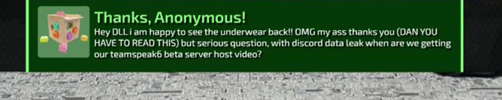 Thanks, Anonymous! Hey DLL i am happy to see the underwear back!! OMG my ass thanks you (DAN YOU HAVE TO READ THIS) but serious question, with discord data leak when are we getting our teamspeak6 beta server host video?