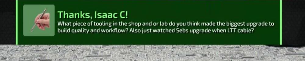 Thanks, Isaac C! What piece of tooling in the shop and or lab do you think made the biggest upgrade to build quality and workflow? Also just watched Sebs upgrade when LTT cable?