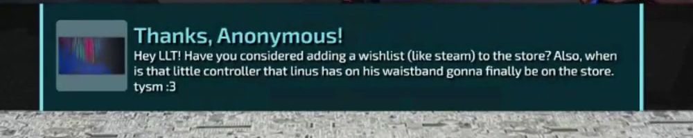 Thanks, Anonymous! Hey LLT! Have you considered adding a wishlist (like steam) to the store? Also, when is that little controller that linus has on his waistband gonna finally be on the store. tysm :3