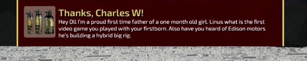 Thanks, Charles W! Hey Dll I'm a proud first time father of a one month old girl. Linus what is the first video game you played with your firstborn. Also have you heard of Edison motors he's building a hybrid big rig.