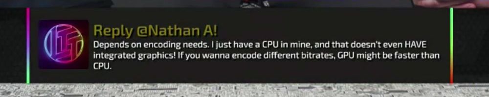 Reply @Nathan A! Depends on encoding needs. I just have a CPU in mine, and that doesn't even HAVE integrated graphics! If you wanna encode different bitrates, GPU might be faster than CPU.