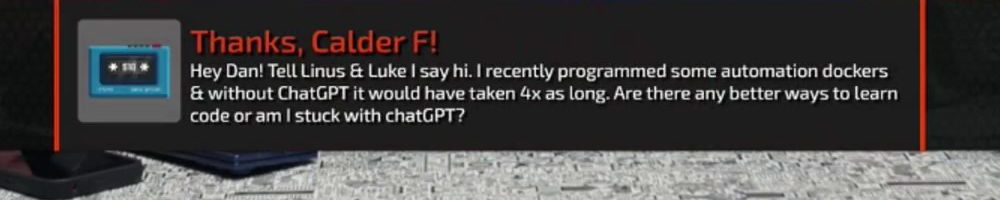 Hey Dan! Tell Linus & Luke I say hi. I recently programmed some automation dockers & without ChatGPT it would have taken 4x as long. Are there any better ways to learn code or am I stuck with chatGPT?