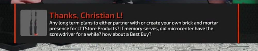 Any long term plans to either partner with or create your own brick and mortar presence for LTTStore Products? If memory serves, did microcenter have the screwdriver for a while? how about a Best Buy?