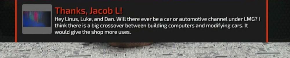 Hey Linus, Luke, and Dan. Will there ever be a car or automotive channel under LMG? I think there is a big crossover between building computers and modifying cars. It would give the shop more uses.