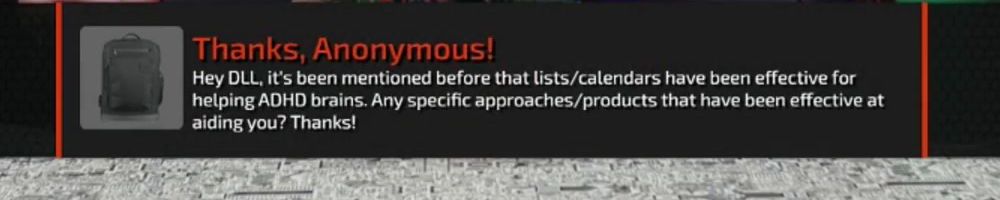 Hey DLL, it's been mentioned before that lists/calendars have been effective for helping ADHD brains. Any specific approaches/products that have been effective at aiding you? Thanks!