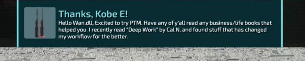 Hello Wan.dll, Excited to try PTM. Have any of y'all read any business/life books that helped you. I recently read "Deep Work" by Cal N, and found stuff that has changed my workflow for the better.