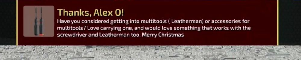 Have you considered getting into multitools (Leatherman) or accessories for multitools? Love carrying one, and would love something that works with the screwdriver and Leatherman too. Merry Christmas