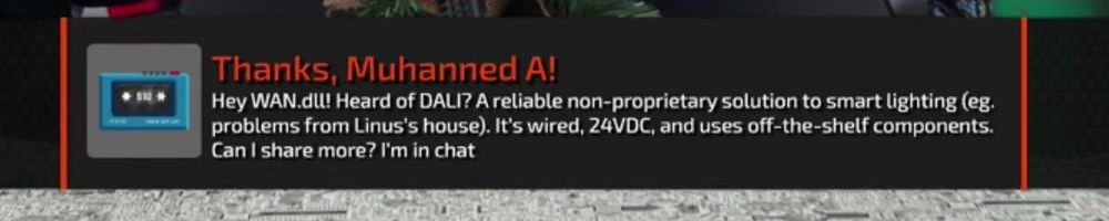Hey WAN.dl! Heard of DALI? A reliable non-proprietary solution to smart lighting (eg. problems from Linus's house). It's wired, 24VDC, and uses off-the-shelf components. Can | share more? I'm in chat