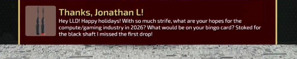 Hey LLD! Happy holidays! With so much strife, what are your hopes for the compute/gaming industry in 2026? What would be on your bingo card? Stoked for the black shaft I missed the first drop!