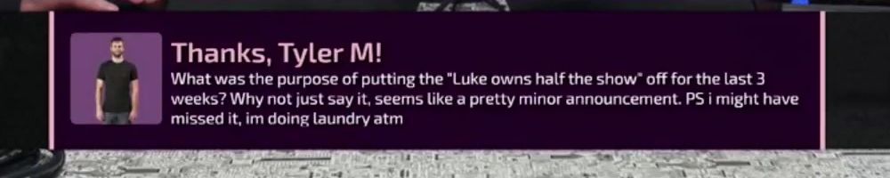 Thanks, Tyler M! What was the purpose of putting the "Luke owns half the show" off for the last 3 weeks? Why not just say it, seems like a pretty minor announcement. PS i might have missed it, im doing laundry atm