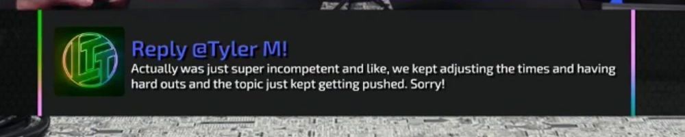 Reply @Tyler M! Actually was just super incompetent and like, we kept adjusting the times and having hard outs and the topic just kept getting pushed. Sorry!