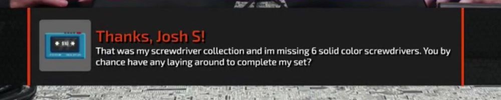 Thanks, Josh S! That was my screwdriver collection and im missing 6 solid color screwdrivers. You by chance have any laying around to complete my set?