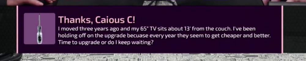 Thanks, Caious C! I moved three years ago and my 65" TV sits about 13' from the couch. I've been holding off on the upgrade because every year they seem to get cheaper and better. Time to upgrade or do I keep waiting?