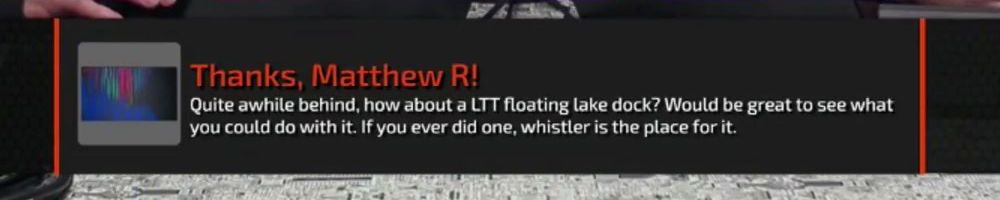 Thanks, Matthew R! Quite awhile behind, how about a LTT floating lake dock? Would be great to see what you could do with it. If you ever did one, whistler is the place for it.
