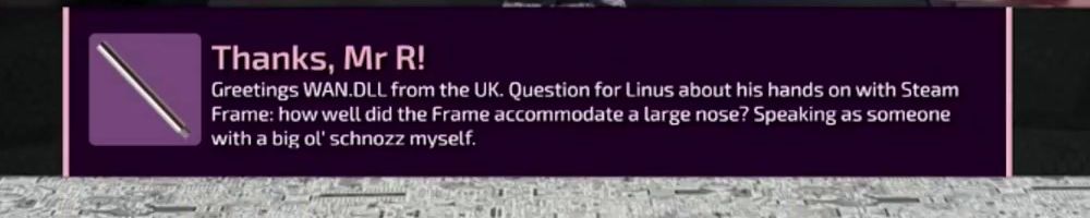 Thanks, Mr R! Greetings WAN.DLL from the UK. Question for Linus about his hands on with Steam Frame: how well did the Frame accommodate a large nose? Speaking as someone with a big ol' schnozz myself.
