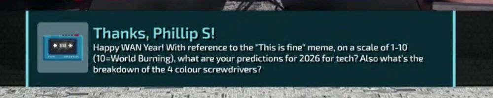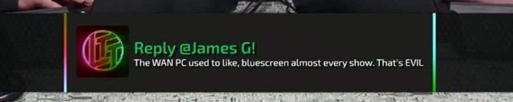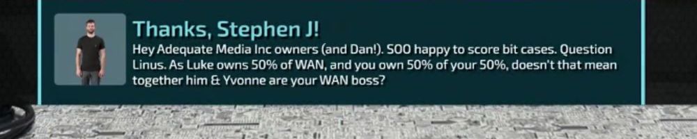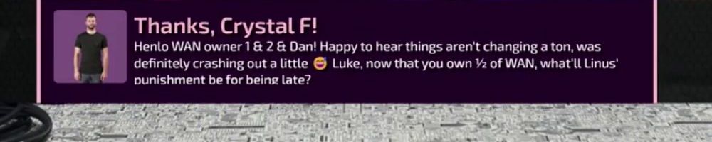 Thanks, Crystal F! Henlo WAN owner 1 & 2 & Dan! Happy to hear things aren't changing a ton, was definitely crashing out a little 🤐 Luke, now that you own ½ of WAN, what'll Linus' punishment be for being late?