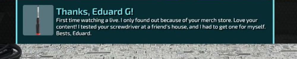 Thanks, Eduard G! First time watching a live. I only found out because of your merch store. Love your content! I tested your screwdriver at a friend's house, and I had to get one for myself. Bests, Eduard.