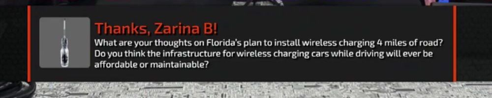 Thanks, Zarina B! What are your thoughts on Florida's plan to install wireless charging 4 miles of road? Do you think the infrastructure for wireless charging cars while driving will ever be affordable or maintainable?