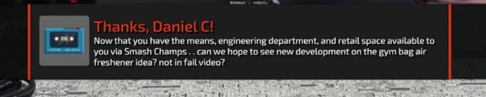 Thanks, Daniel C! Now that you have the means, engineering department, and retail space available to you via Smash Champs .. can we hope to see new development on the gym bag air freshener idea? not in fail video?